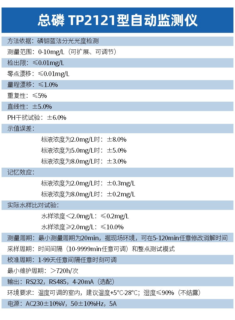 水样、催化剂溶液和强烈氧化剂消解溶液的混合液加热到115℃,水样中聚磷酸盐和其他含磷化合物,在高温高压的酸性条件下被强烈氧化剂消解氧化生成磷酸根,在催化剂存在下,磷酸根离子在含钼酸盐的强酸溶液中,生成一种带色络合物,分析仪检测此颜色的变化,并把这种变化换算成总磷值输出来。生成的带色络合物量相当于总磷量。